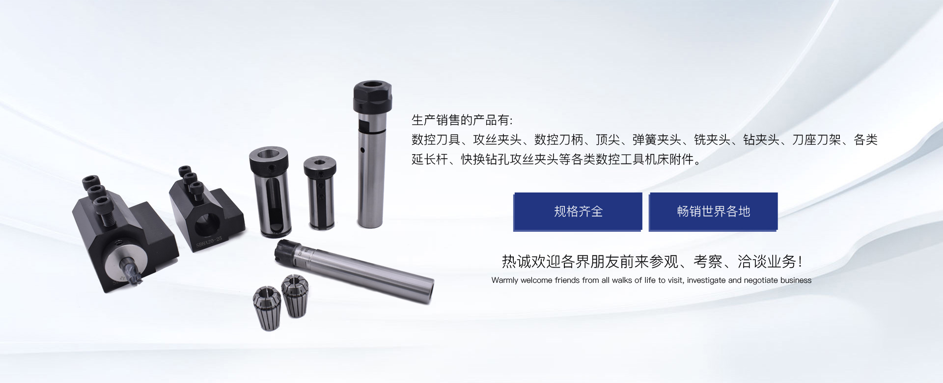 生產銷售的產品有:數控刀具、攻絲夾頭、數控刀柄、頂尖、彈簧夾頭、銑夾頭、鉆夾頭、刀座刀架、各類延長桿、快換鉆孔攻絲夾頭等各類數控工具機床附件。